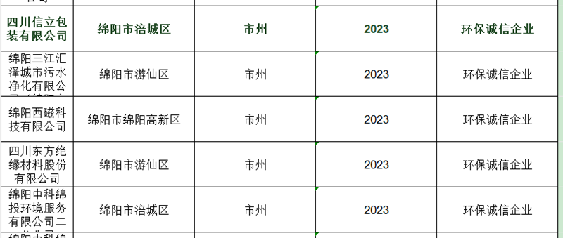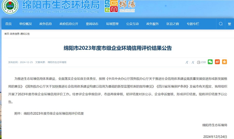 近日,从绵阳市生态环境局发布的关于《绵阳市2023年度市级企业环境信用评价结果公告》中获悉,米兰游戏获评绵阳市2023年度“环保诚信企业”。